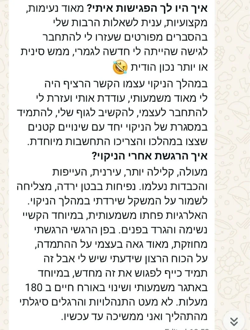 היום אני יכולה להגיד שהבראתי מכל מה שרציתי להבריא ממנו, המטרה שלי היום היא להנגיש את הרפואה העתיקה וההוליסטית לכולם כדי שכולנו נוכל להבריא, להרפות ולהרפא.